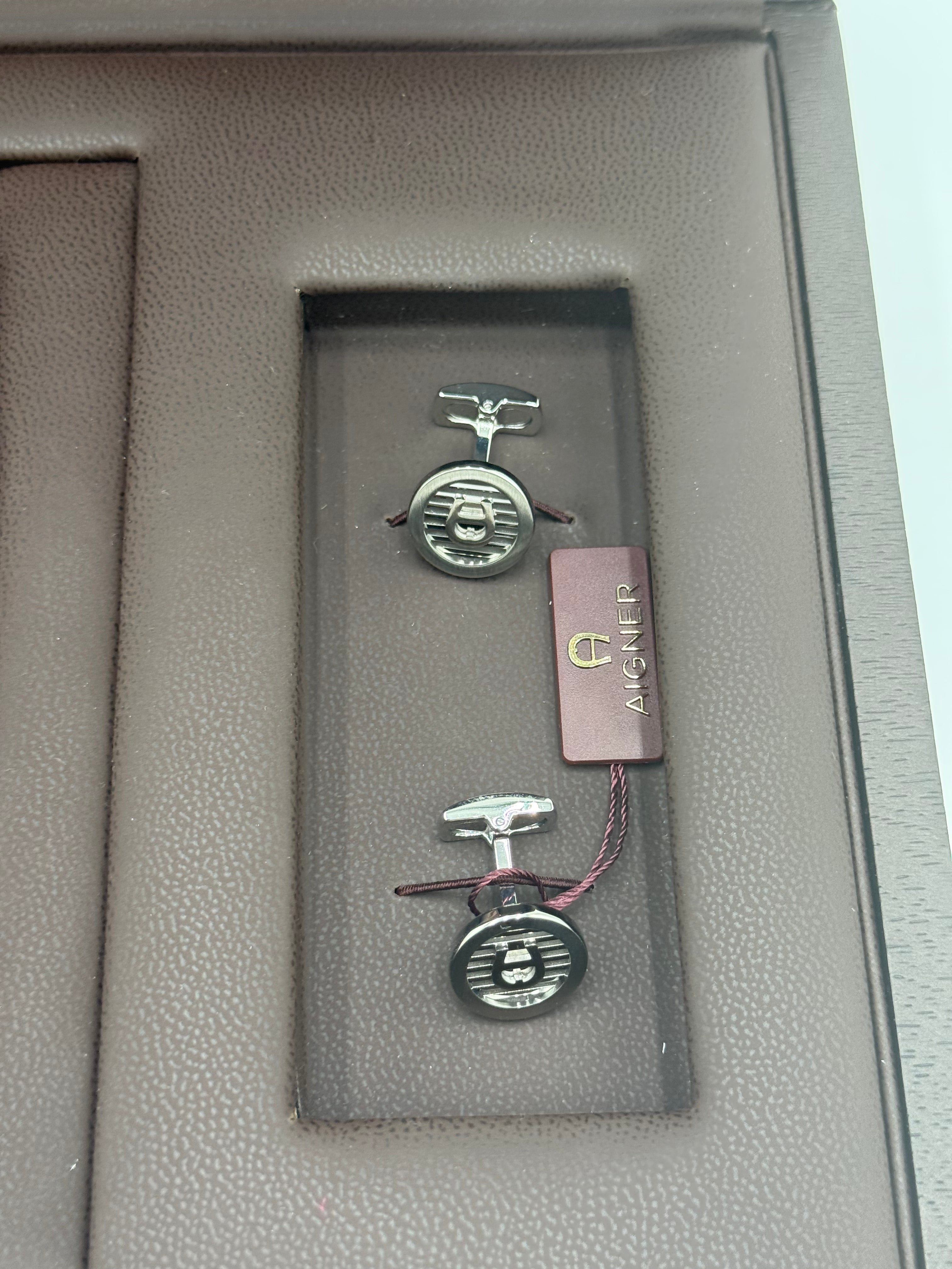 - A pair of AIGNER cufflinks with the signature logo, neatly set on the right