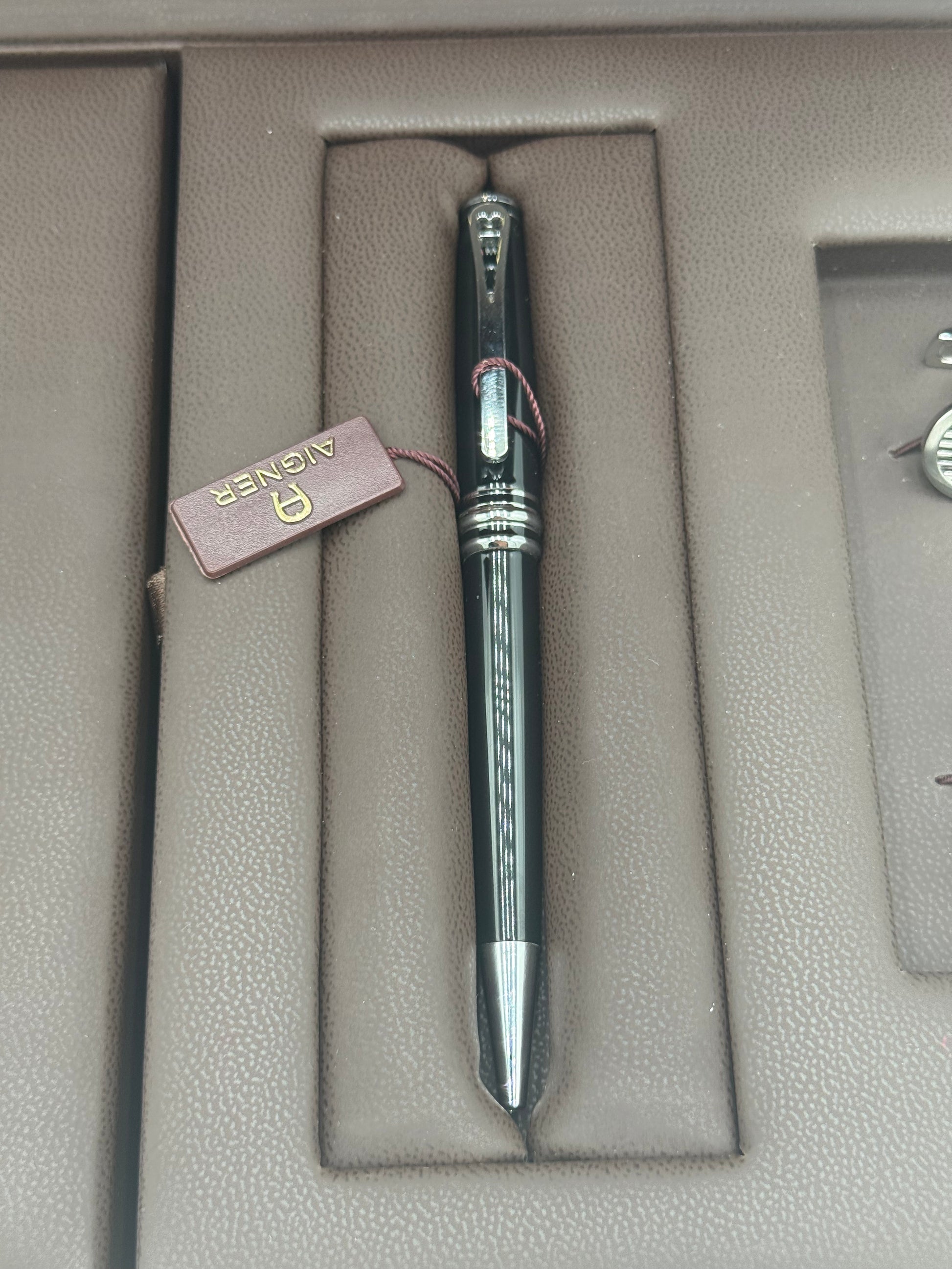 - A premium AIGNER ballpoint pen in black with silver accents, placed in the center