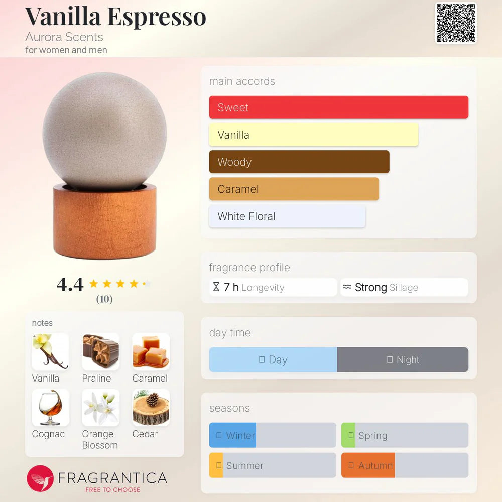 Aurora Vanilla Espresso is an exquisite unisex fragrance that opens with refreshing top notes of Mandarin and the rich warmth of Cognac. The scent evolves into a smooth, long-lasting experience that blends sweet and spicy nuances, perfect for any occasion. The bottle design is as captivating as the fragrance itself – sleek, elegant, and modern. A true sensory delight from the Perfumista collection, designed to leave a lasting impression.