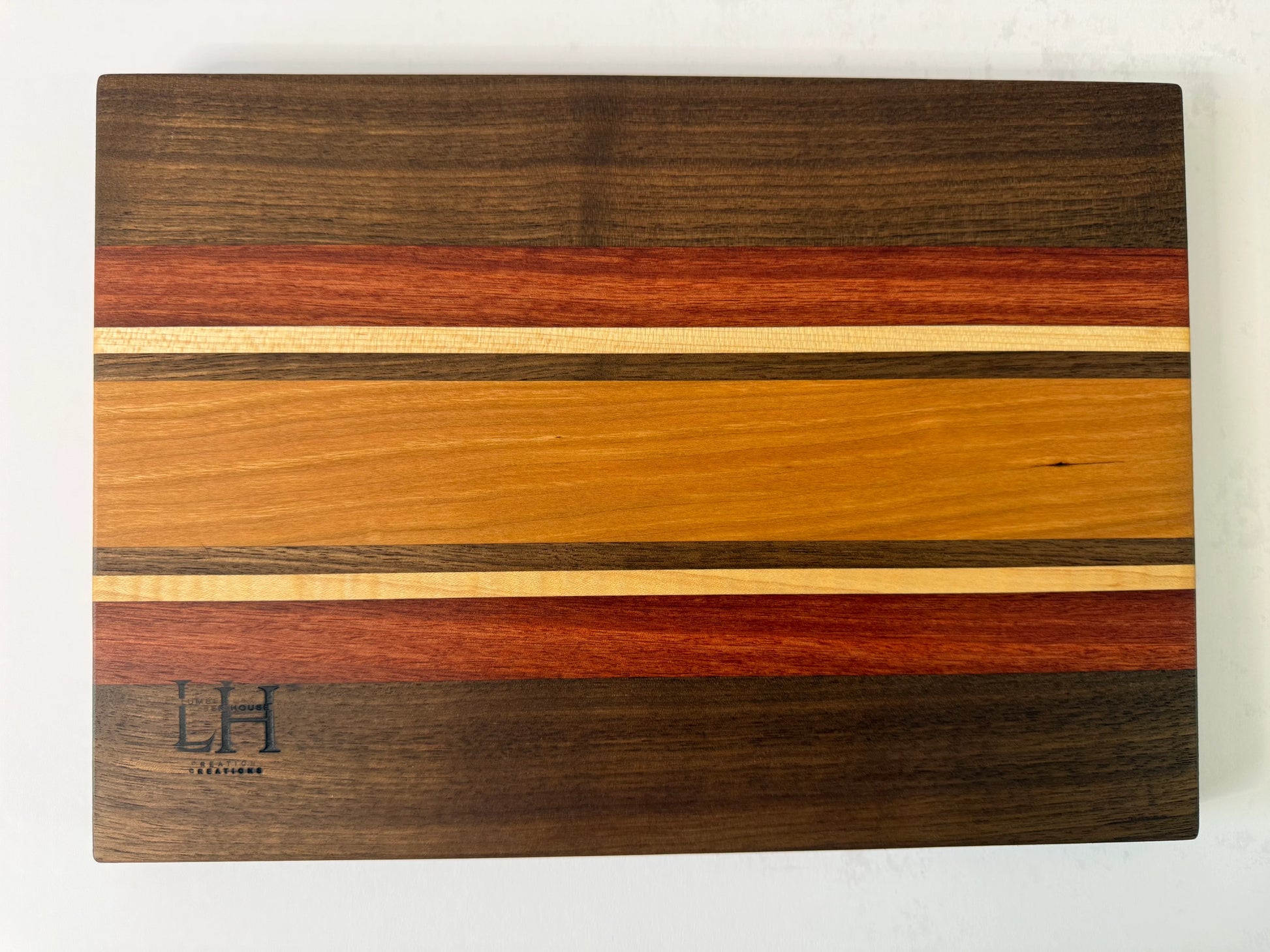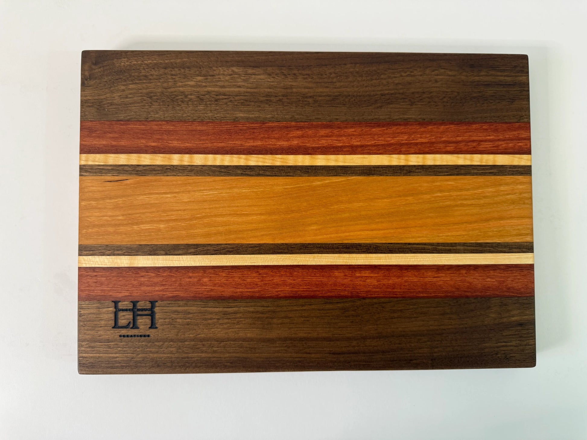 Each board is a unique work of art, showcasing the vibrant colors and textures of premium hardwoods. Perfect for home chefs or as a thoughtful, handcrafted gift.