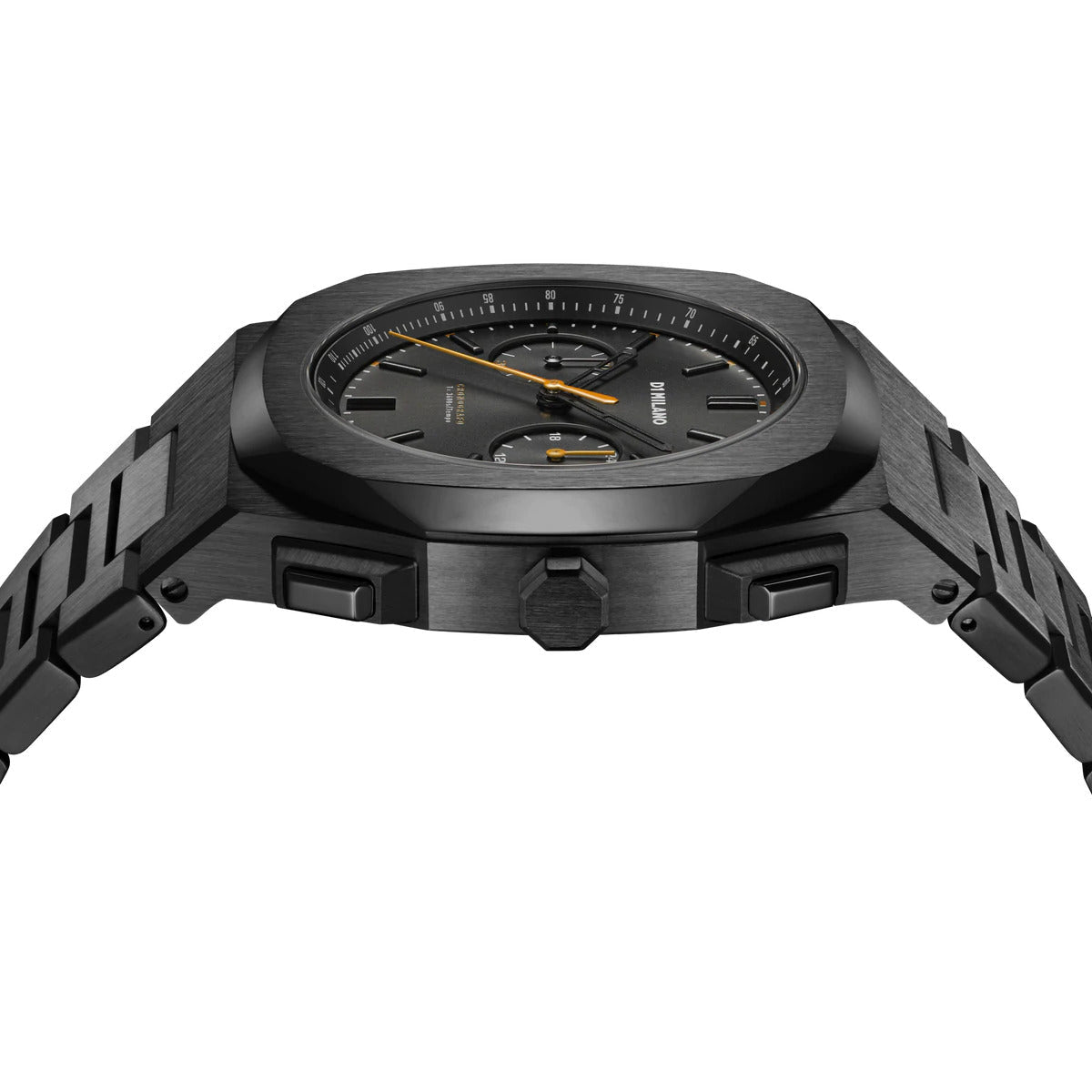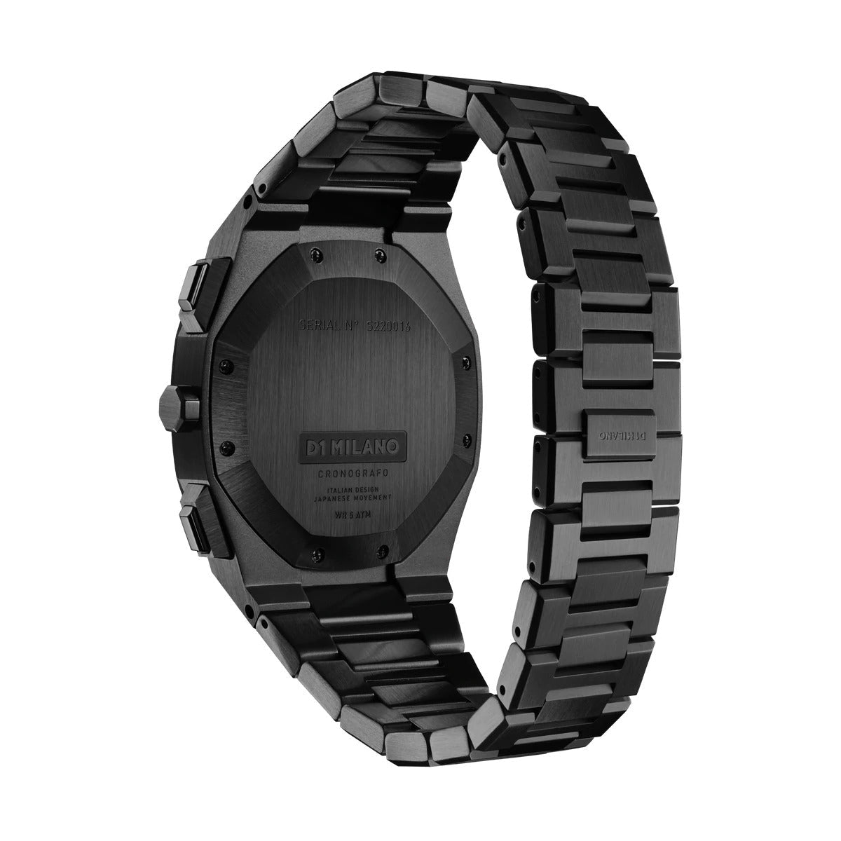 This D1 Milano black watch features a high-quality bracelet made of stainless steel (stainless steel) and a stainless steel case (stainless steel) measuring 41.5 mm and 11 mm thick, protected by a layer of sapphire glass with strong anti-reflective blue coating, and quartz movement Reliable and the watch has a water resistance of up to 50 meters