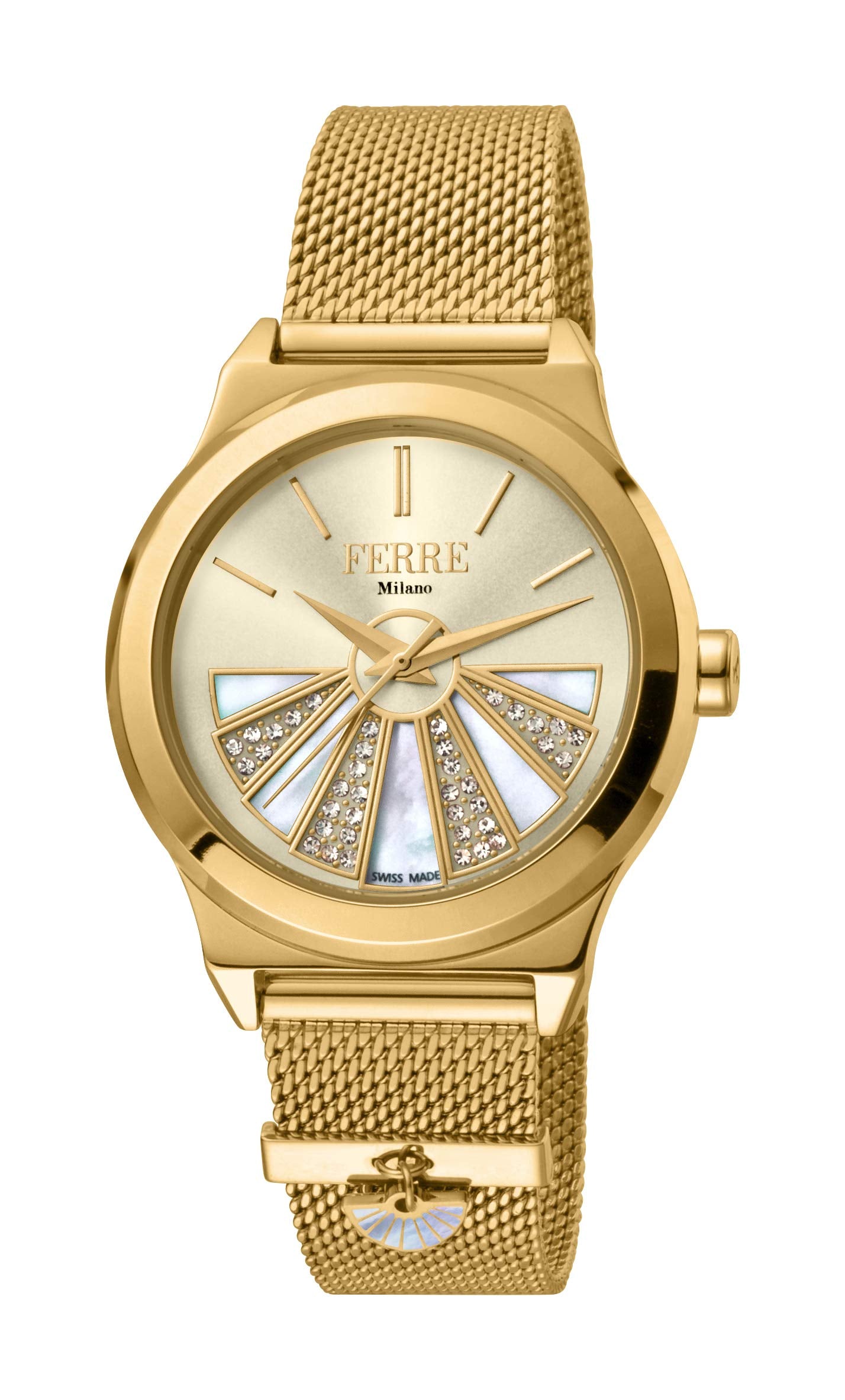 Ferre milano ladies watch stainless steel / gold plated case & gold-tone mesh bracelet with stone on the dial