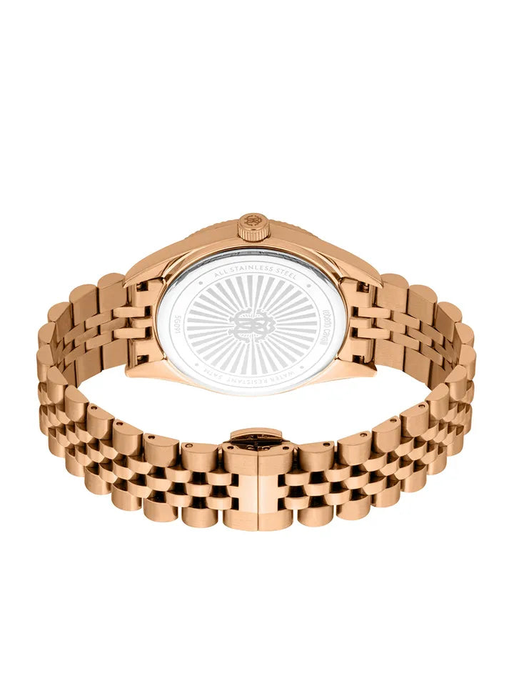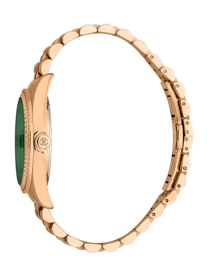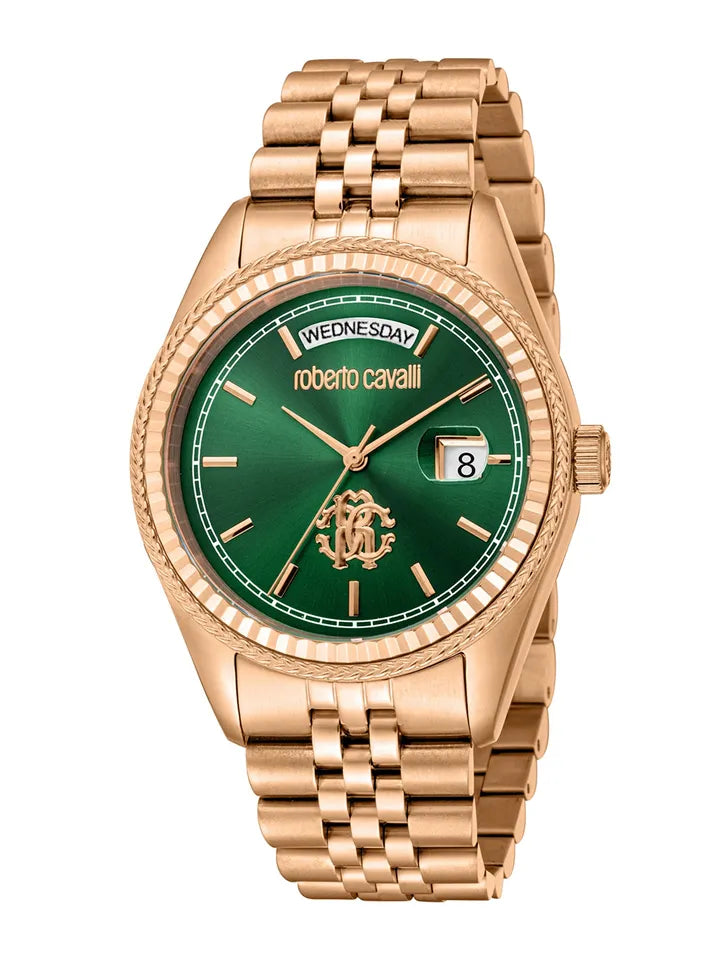The watch features a striking green sunray dial paired with a refined gold-tone fluted bezel, creating a rich, eye-catching contrast. A day and date display adds everyday practicality, while the iconic Roberto Cavalli emblem on the dial reflects true Italian luxury.