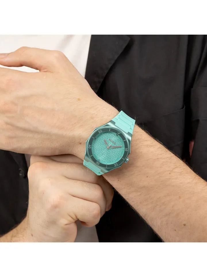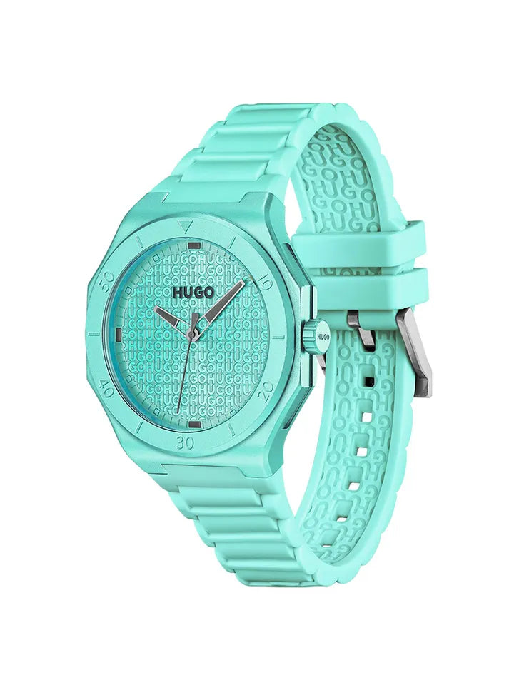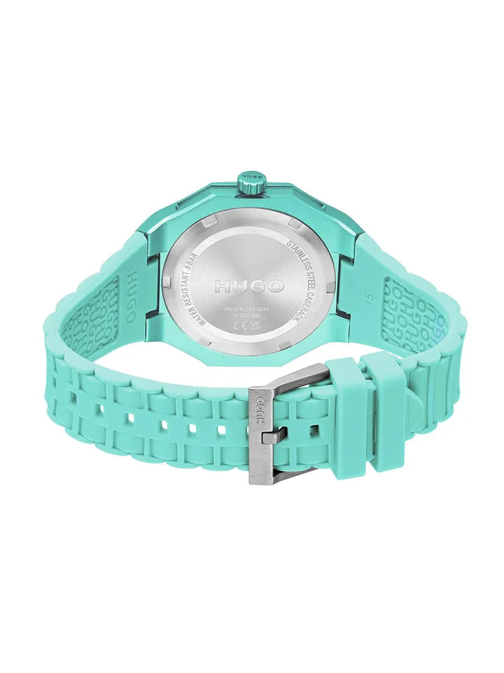 Strap Style: green, textured, silicon strap with a tang Water resistance: 50 m