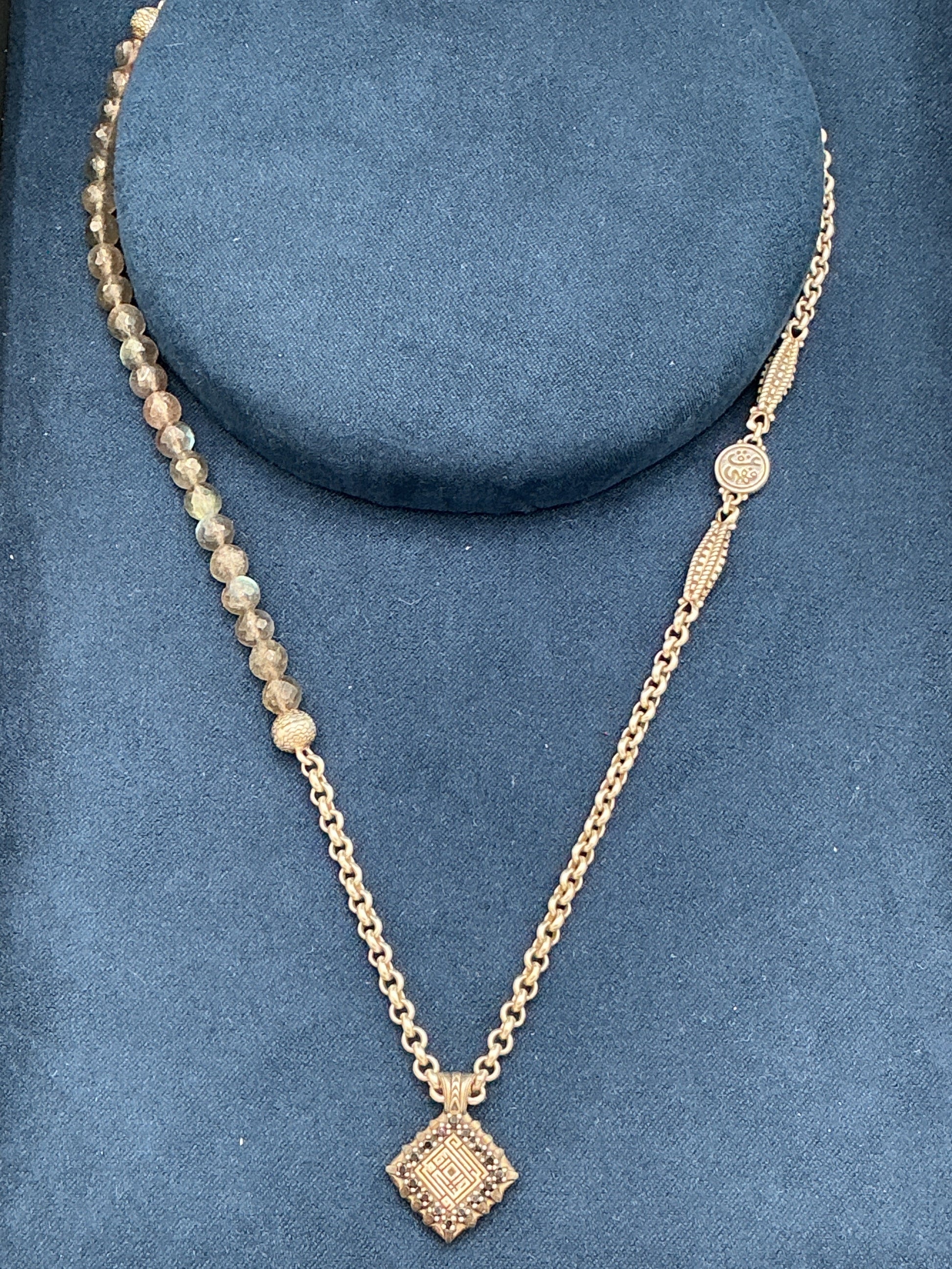 Sterling silver necklace adorned with an array of beaded stone, with a pendant featuring Kufic-inspired calligraphy “contentment & union”