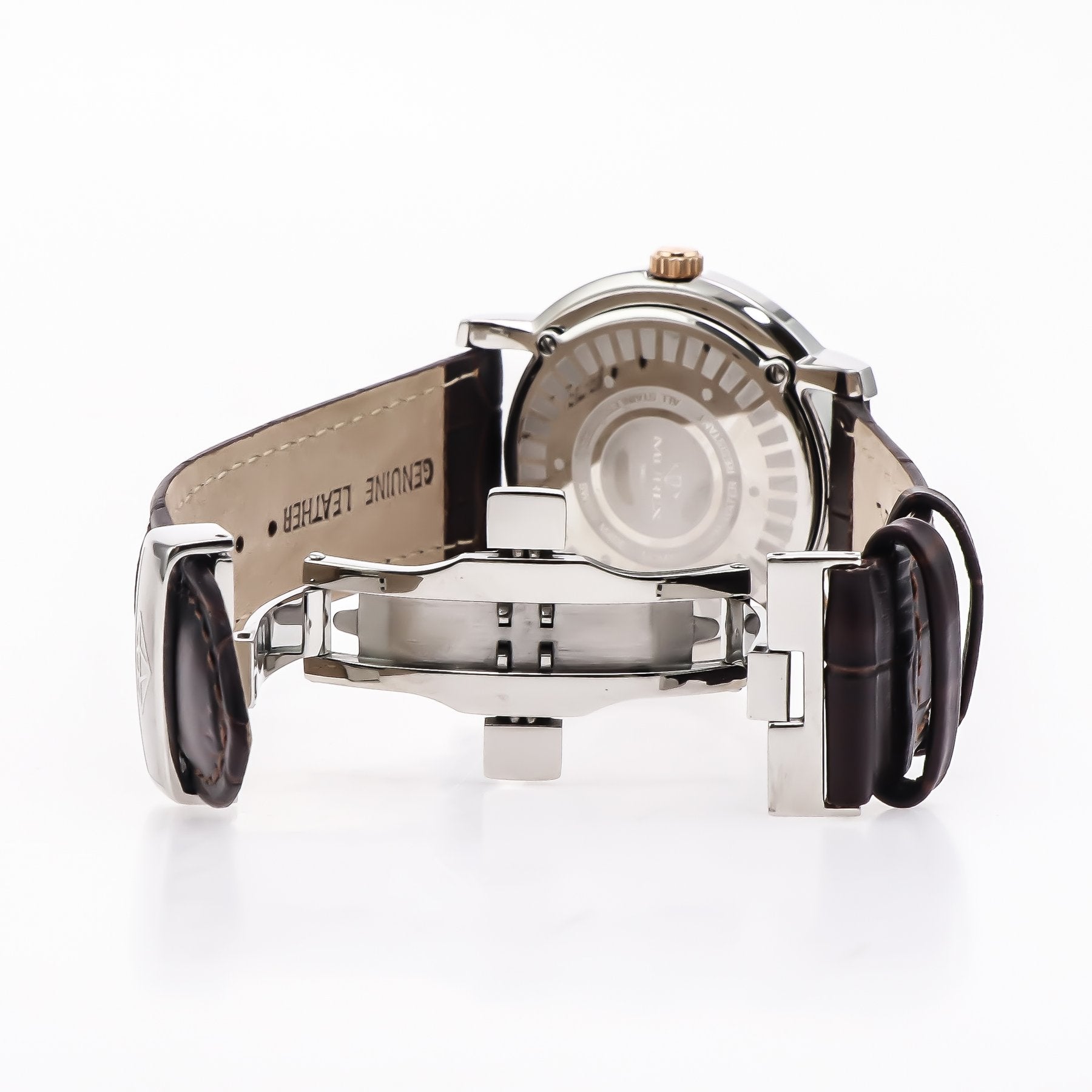 Bracelet/strap: Brown genuine leather strap, 22mm wide, with a butterfly clasp.