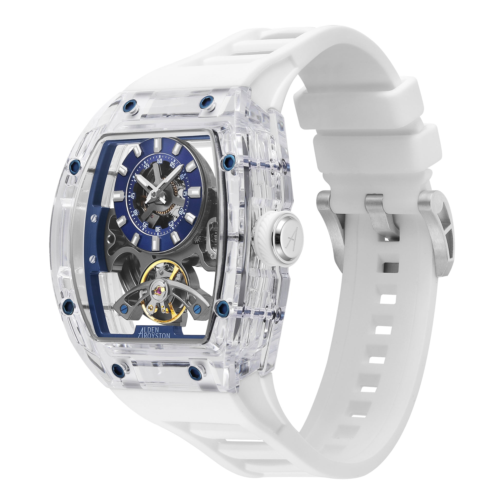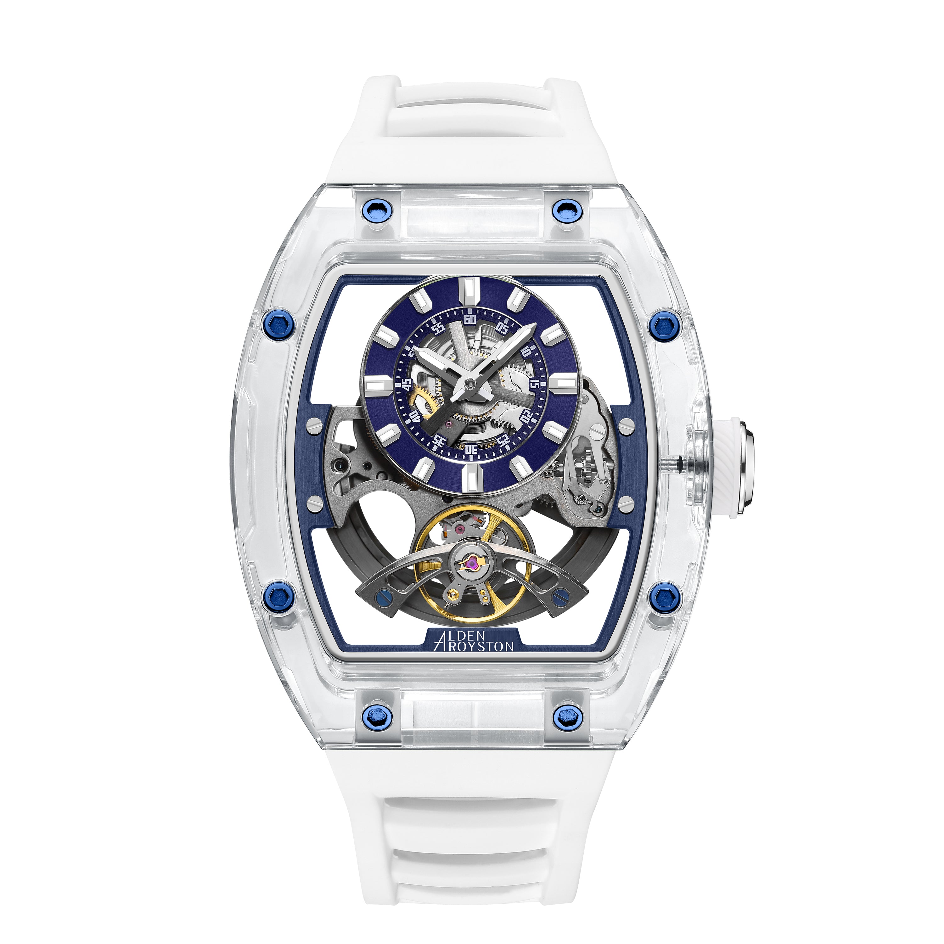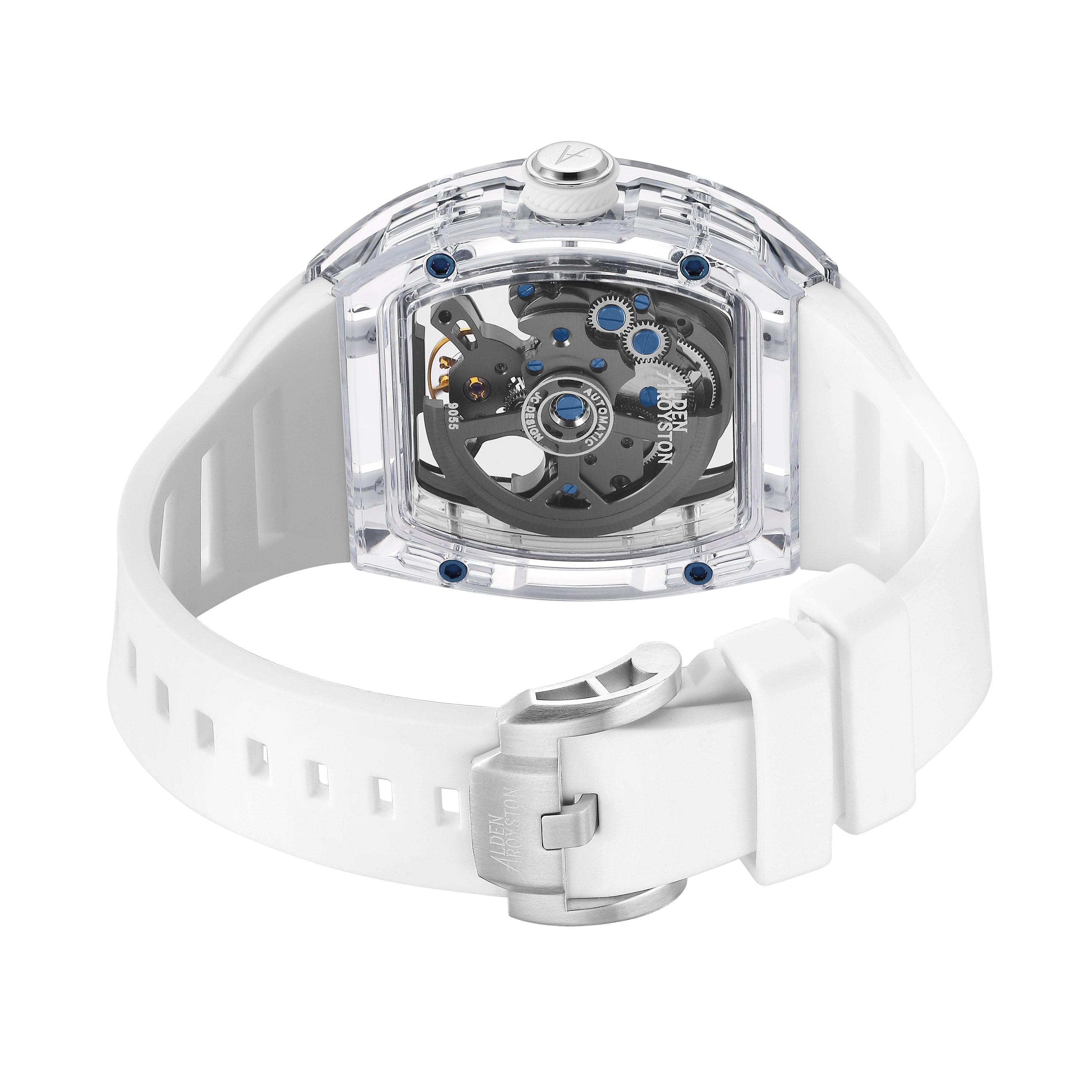 The Alden Royston Transparent Mechanical Watch is built around a modern watchmaking philosophy, bringing the mechanical movement into full view. The transparent case reveals the rhythm of time, allowing every motion of the movement to be seen and appreciated. Blue accents contrast with the finely engineered metal structure, balancing technical strength with a refined, contemporary aesthetic. The open-work dial highlights gears, bridges, and the balance wheel, creating depth and visual clarity unique to mechanical timepieces. More than a watch, it is a mechanical statement. Created for those who truly understand the beauty of mechanics.